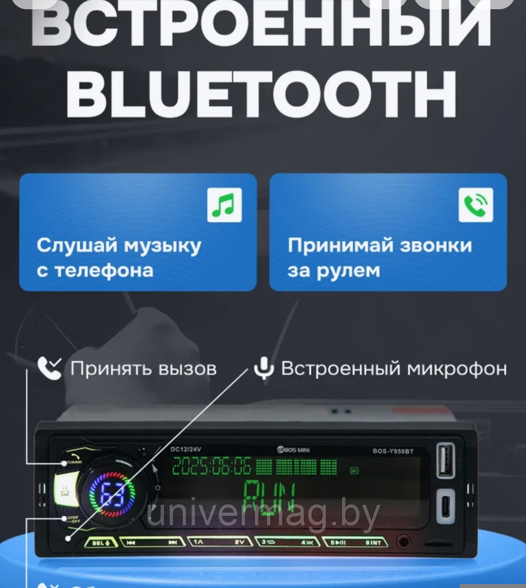Автомагнитола BOS-MINI BOS-Y950BT 1Din, Bluetooth, USB, AUX, 12-24V