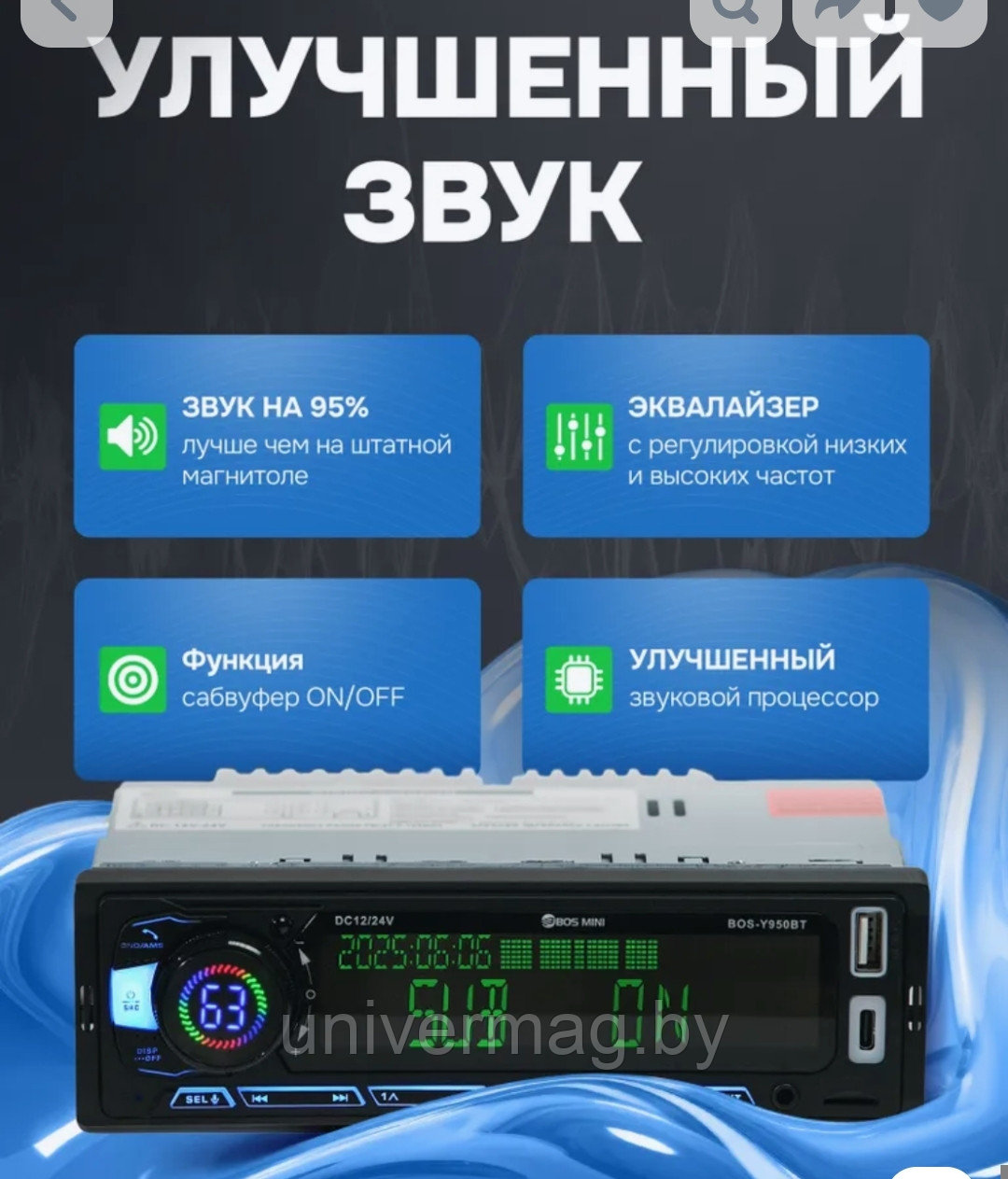 Автомагнитола 1DIN BOS - MINI -Y950BT(12V-24V) - это идеальное решение для тех, кто хочет наслаждаться качественным звучанием музыки во время вождения. Эта автомагнитола оснащена графическим LCD-экраном диагональю 5 дюймов с разрешением 1280x1024 пикселей, что обеспечивает отличную видимость информации даже при ярком солнечном свете. Одной из главных особенностей этой автомагнитолы является наличие функции Bluetooth, которая позволяет подключать мобильные устройства и слушать музыку без проводов. Кроме того, эта автомагнитола поддерживает множество форматов файлов, включая MP3 и FLAC, а также имеет возможность воспроизведения музыки с USB-накопителей и карт памяти. Автомагнитола 1DIN BOS - MINI -Y950BT(12V-24V) также обладает высокой выходной мощностью на канал - 50 Вт, что обеспечивает чистое и яркое звучание музыки. Кроме того, эта автомагнитола имеет регулировку громкости, баланса, тембра и других параметров звука, что позволяет настроить звучание под свои предпочтения Эта автомагнитола 1DIN BOS - MINI -Y950BT(12V-24V) также имеет поддержку Android и iOS, что делает ее удобной для использования как с мобильными телефонами, так и с планшетами. Кроме того, она имеет функцию поиска по файлам, что позволяет быстро находить нужные треки в большом каталоге музыки Она комплектуется ключом-съемником, системой крепления, ИК-пулом ДУ и внешним микрофоном, что обеспечивает полную функциональность и удобство использования.